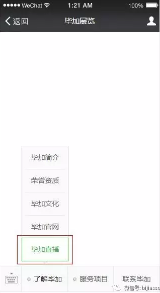 方式一,關(guān)注我們畢加展覽的微信公眾號:bijiasso,關(guān)注后進入平臺,左下方有個畢加直播,點擊可觀看,如下圖