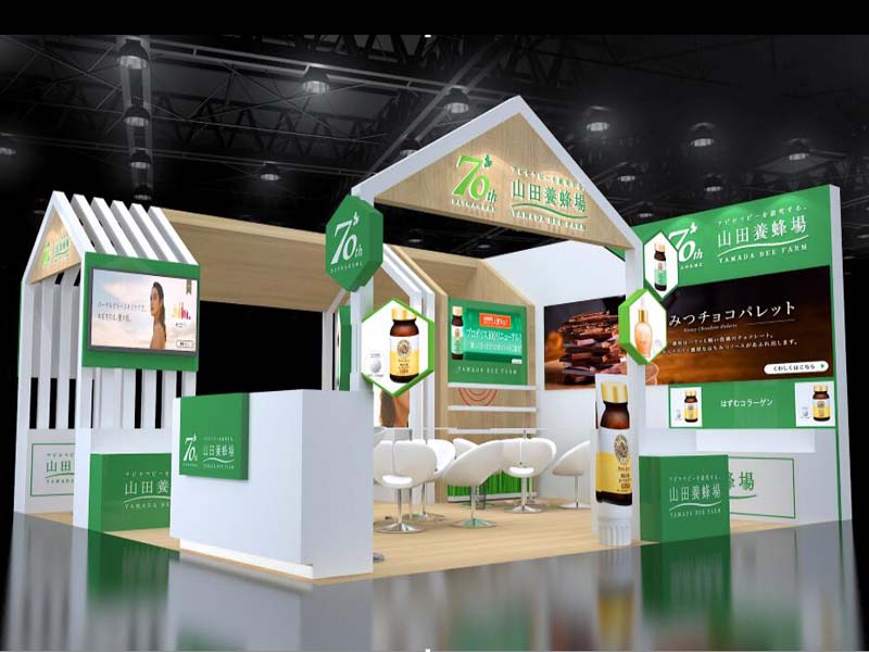 山田養(yǎng)蜂場——美博會設(shè)計搭建,契合山田養(yǎng)蜂場國際品牌形象和產(chǎn)品特性,采用綠色和白色主色調(diào),再搭配燈具燈光的效果,襯托出展位潮流,精致的氛圍,突出參展商的企業(yè)品牌和產(chǎn)品個性。